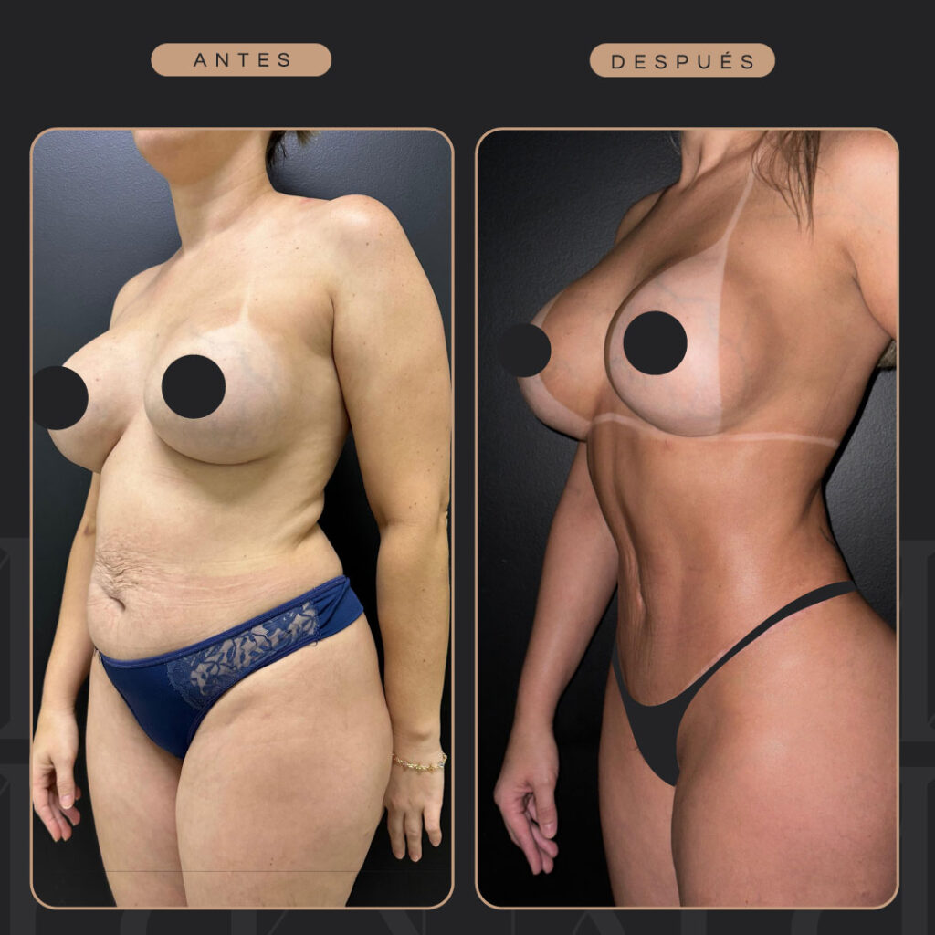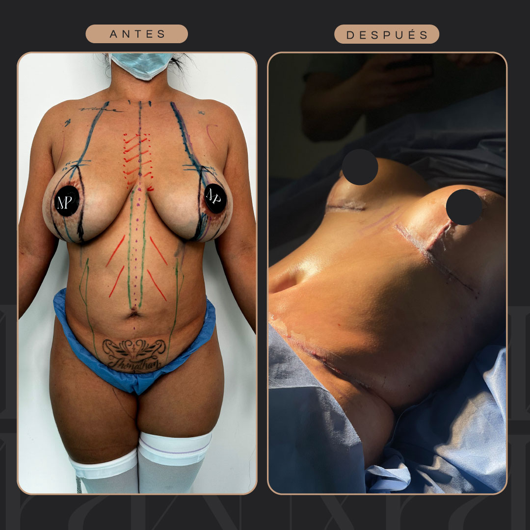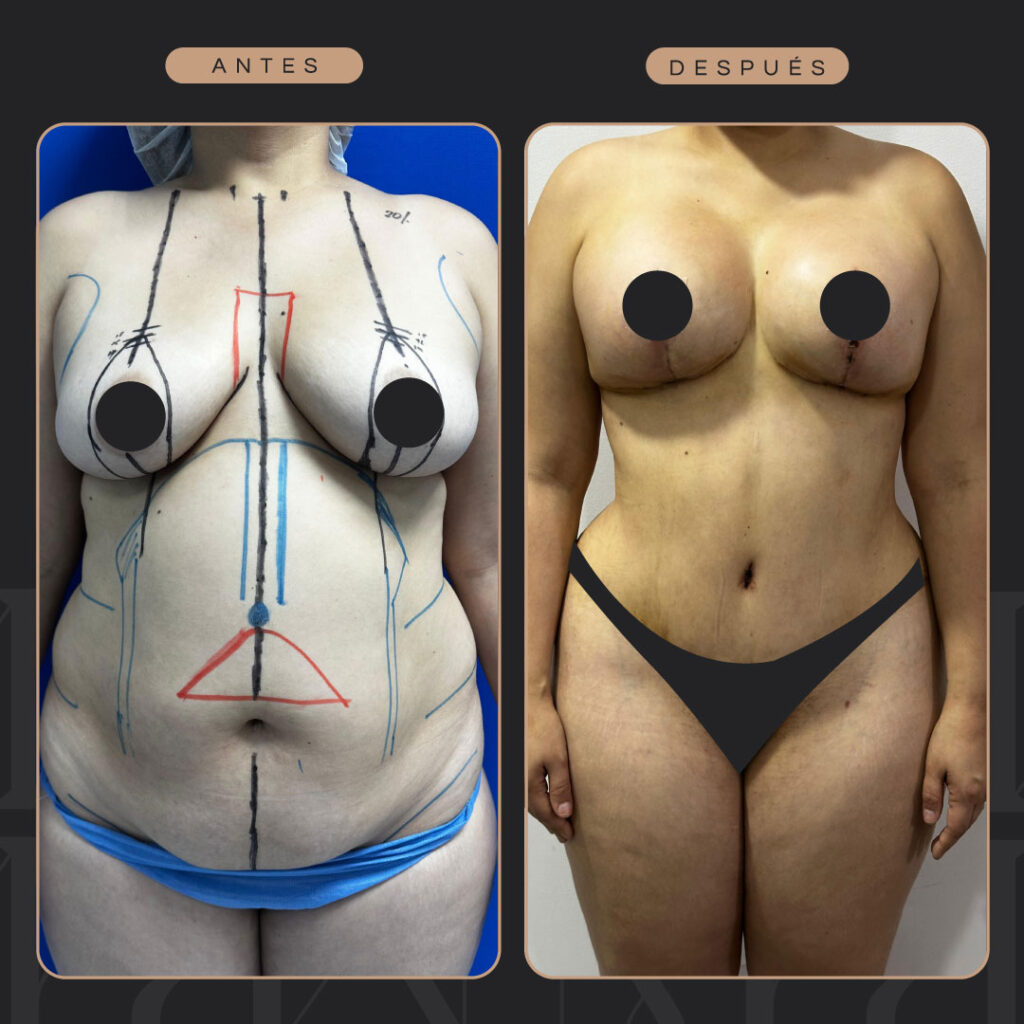 Procedimiento integral que combina cirugía de senos, abdominoplastia y liposucción en una sola intervención, diseñado específicamente para restaurar el cuerpo femenino después del embarazo, abordando los cambios físicos más comunes tras la maternidad o en cuerpos con exceso de piel o post cirugías bariátricas.